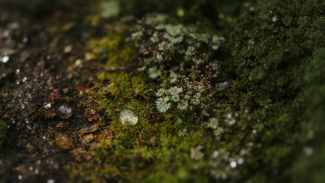 AI Generated Video. This incredible close-up of a forest floor teems with rich biodiversity, capturing intricate moss clusters dotted with dew droplets. Use this visually serene exploration to emphasize themes of ecology, microorganisms, and the complexity of natural habitats, suitable for environmental projects, biological studies, or educational materials aimed at highlighting the essential role of ecosystems in nurturing flourishing life.