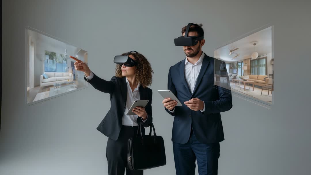 AI Generated Image. Two business professionals wearing VR headsets exploring virtual property tours projected before them while holding tablets, woman pointing toward virtual living room and man interacting with tablet controls. Neutral gray background emphasizing floating interior render panels and realistic room renderings. Useful for marketing virtual property tours, showcasing proptech solutions, presenting architectural visualizations, running remote client walkthroughs, and training sales teams on immersive tools. Perfect for website hero banners, explainer videos, pitch decks, product demos, social media ads, and editorial pieces about digital transformation in real estate. Customization ideas: replace interior panels with branded listings, overlay text highlights for room features, add animated transitions for video versions, and use crop for hero banner or square format for social posts.