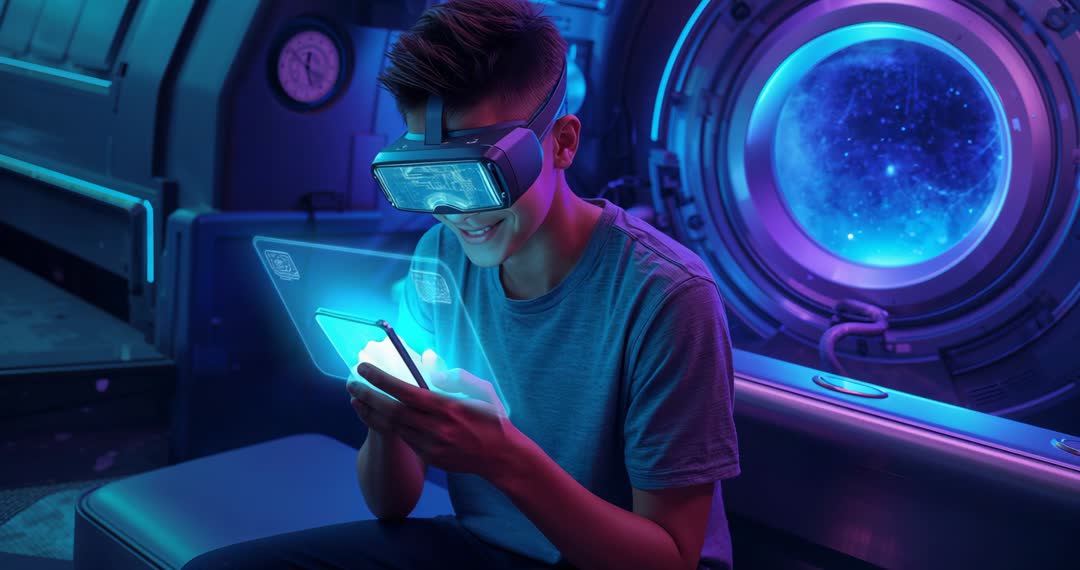AI Generated Video. Young individual interacts with virtual reality headset while navigating digital holograms in futuristic spacecraft cabin. Illumination from digital displays enhances immersion, showcasing advancements in VR technology and inventive virtual spaces. Useful for showcasing innovations in immersive experiences, technology developments in entertainment, or educational content on the potential of VR.