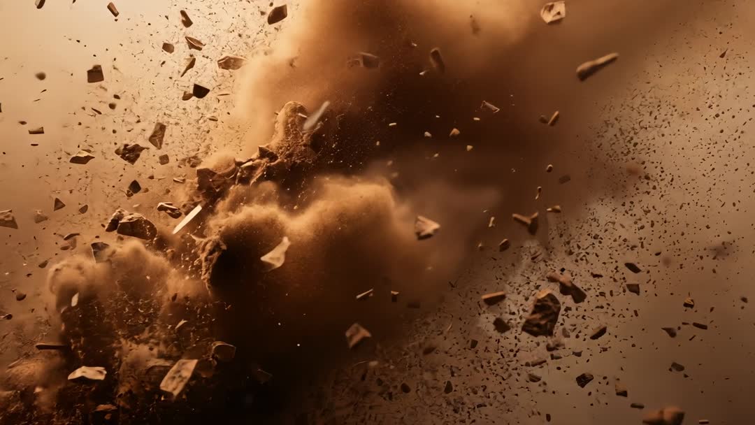 AI Generated Image. This highly detailed CGI visualization shows rock fragments explosively detaching, creating a swirling dusty nebulous cloud. The dynamic motion and layering produce an energetic effect emphasizing tangible chaos and excitement perfect for special effects in film production, geological documentaries, or artistic representations in digital media showcasing abstract expressions of power, energy, and movement.
