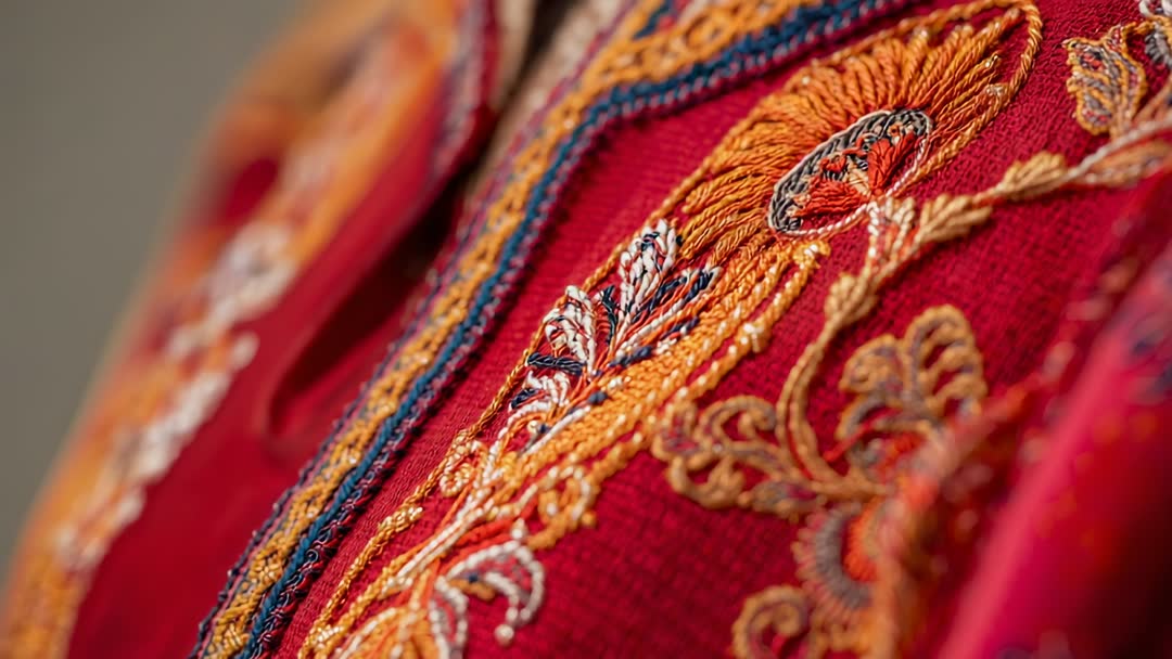 AI Generated Image. This video frame showcases intricate and luxurious embroidery on a vibrant red fabric, highlighting meticulously woven patterns with orange, blue, and gold threads. Ideal for advertising high-end textile quality or illustrating fine craftsmanship in artisanal fashion content.