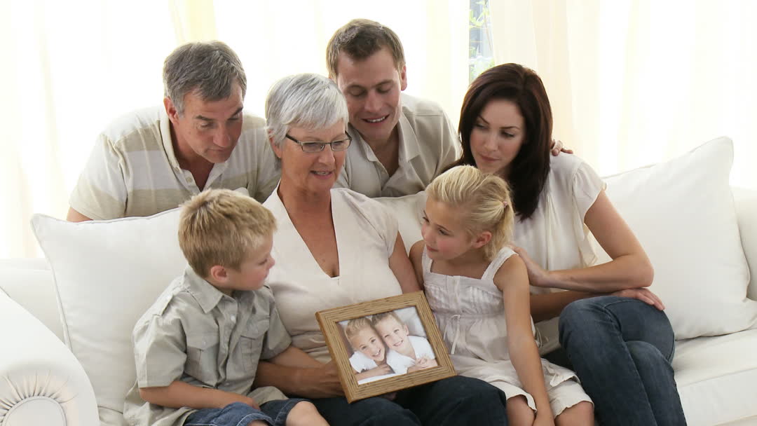 Extended Family Relaxing on Sofa with Framed Photo Video