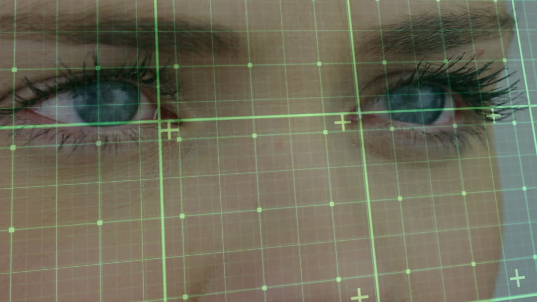 Eye-Tracking Technology Over Woman's Eyes with Digital Grid Overlay Video