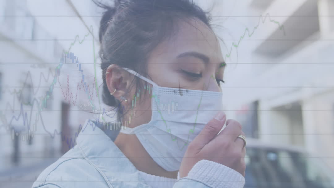 Asian woman wearing medicine mask stands outdoors, with data visualization graphics superimposed, suggesting themes of urban life during health challenges, technology's role in monitoring, and global digitization trends. Perfect for depicting healthcare aspirations, technology integration in public health monitoring, and situations involving safety measures in urban settings.