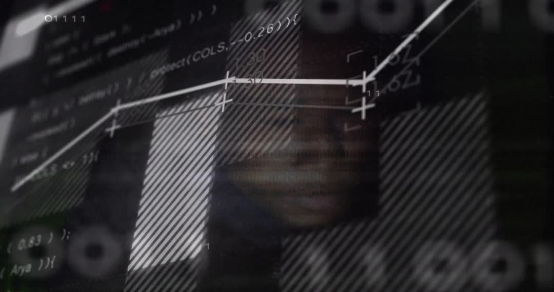 Scene represents advanced technology where facial recognition merges with digital data skins such as binary codes and graphs, offering a peek into futuristic analytics. Perfect for projects related to AI development, education in data science, cutting-edge security technology shows, presentations on digital innovations, and visual storytelling in movies or series tackling futuristic themes.
