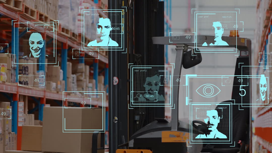 A scene depicting digital facial recognition interfaces superimposed on a warehouse environment. Potentially useful for illustrating advancements in warehouse logistics, security systems, or modern industrial automation processes. Also applicable in discussions about digital user interfaces and technology integration in business operations.