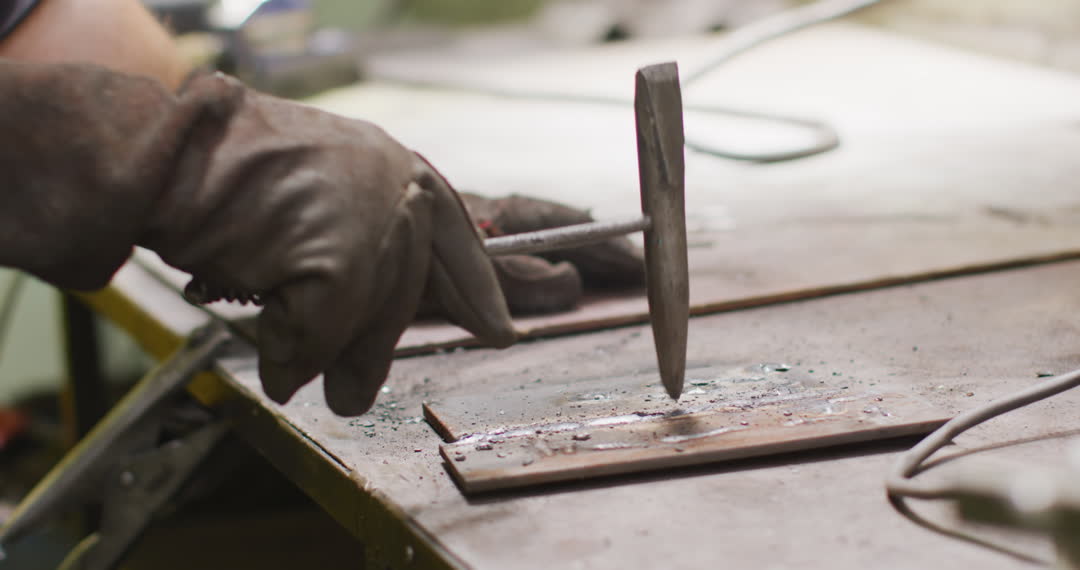 The video captures the hands of a factory worker, clad in safety gloves, engaged in precise metal part handling in a workshop. This scene symbolizes industrious manual labor, industrial precision, and a focus on safety and craftsmanship in a manufacturing environment. Useful for topics related to industrial work environments, occupational safety, manufacturing craftsmanship, and STEM fields.