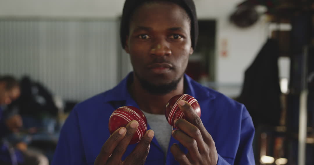 An African American man carefully inspects two cricket balls in a workshop setting, indicative of precise craftsmanship and meticulous attention to detail. The setting reflects a highlight of the skilled labor involved in the manufacturing process in a uniquely specialized industry. This video is ideal for articles or promotions related to sports manufacturing, skilled trades, and quality control. It can also be used to depict industrial occupation themes and the importance of artisanal inspection in production lines.
