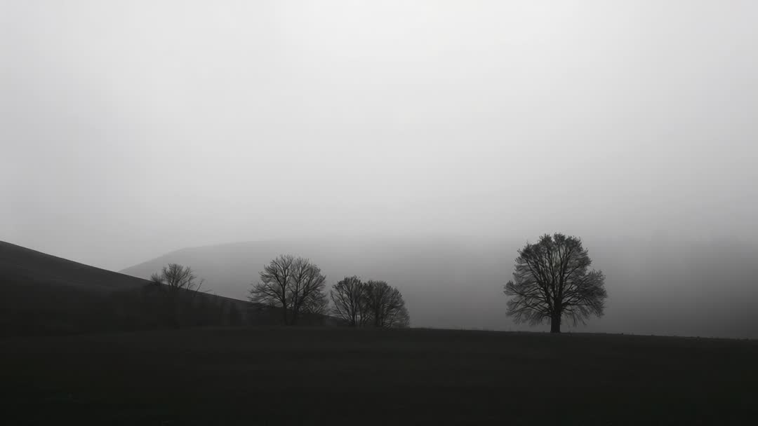 AI Generated Image. Video showing lone deciduous tree silhouetting on right side of meadow while smaller tree groupings recede into thickening fog. Monochrome palette creating moody, minimalist composition with wide negative space for copy. Slow cinematic pace or gentle still framing working well for background in web banners, title screens, editorial spreads, album covers, mindfulness apps, and nature documentaries. Conveying themes of solitude, reflection, memory, time, and atmospheric weather. Perfect for print wall art, social media posts, and marketing campaigns needing calm, contemplative visuals.