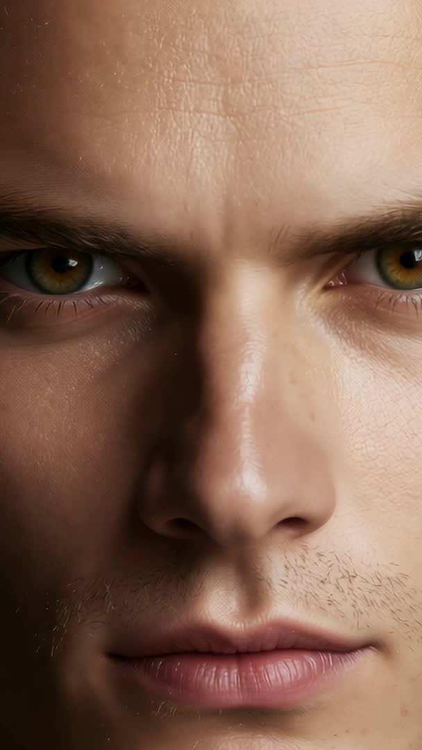 AI Generated Image. Video showing extreme close-up of young male face slowly fading as frontal light dims until complete blackout. Composition focusing on eyes, nose, lips and skin texture, creating chiaroscuro contrast and moody introspection. Frontal soft key producing low-key atmosphere with strong shadow falloff and high detail in skin pores and facial hair. Short 5-15 second clip ideal for teasers, title sequences, social media stories and mobile ads. Working well for film intros, music visuals, psychological storytelling, mental health campaigns, grooming or skincare promos, and cinematography or lighting tutorials. Editing suggestions: loop fade for seamless transition, add ambient low-frequency sound for tension, apply subtle color grade toward warm or neutral tones, keep 9:16 aspect ratio for mobile-first delivery, use as dramatic background for text overlays or cuts to wider shot.