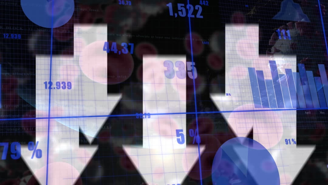 Visual displays falling arrows and data metrics intertwined with a microscope video of covid-19 cells, reflecting the intersection of pandemic impacts and business performance. Useful for illustrating topics related to economic effects of pandemics, financial declines, and crises in healthcare finance. Can be utilized in articles, reports, or presentations on pandemic-related economic studies.