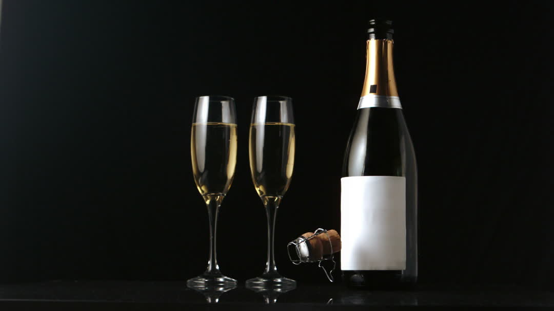 - Falling Champagne Cork with Flutes and Bottle Celebration Scene