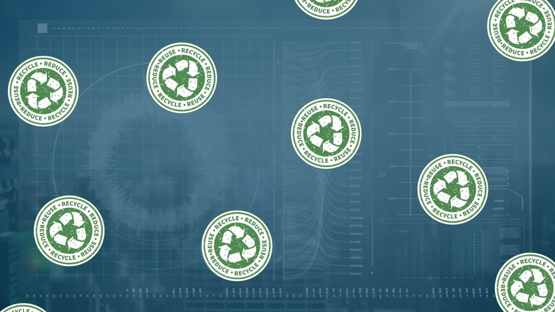 Eco-friendly symbols appear over a backdrop filled with digital data, creating a modern and technological ambiance. Perfect for use in presentations or campaigns promoting sustainability, green energy, recycling innovations, and reduced environmental impact for businesses or educational content.