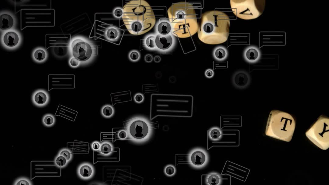 Falling letter cubes forming connectivity network with glowing avatars, drifting chat bubbles Video