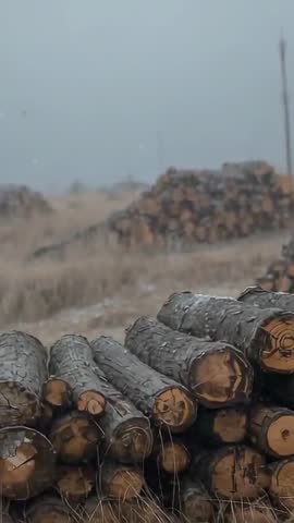 AI Generated Video. Vertical video showing falling snow dusting stacked logs on dry grass in rural field with distant utility pole. Calm wintry atmosphere evoking rustic farm or timber yard mood. Strong foreground texture from log ends and cracked bark creating visual depth and tactile detail. Useful for social media reels, Instagram Reels, TikTok clips, vertical ads, website hero backgrounds and mobile-first campaigns. Suitable for forestry marketing, lumber company promotions, seasonal winter campaigns, nature documentaries, rustic lifestyle storytelling and environmental awareness projects. Easy to loop for ambient background or to slow down for dramatic closeups. Color grading suggestions include cool desaturated tones for moody look or warm highlights for cozy contrast. Footage working well with text overlay, title cards, or soundtrack of soft wind and falling snow.