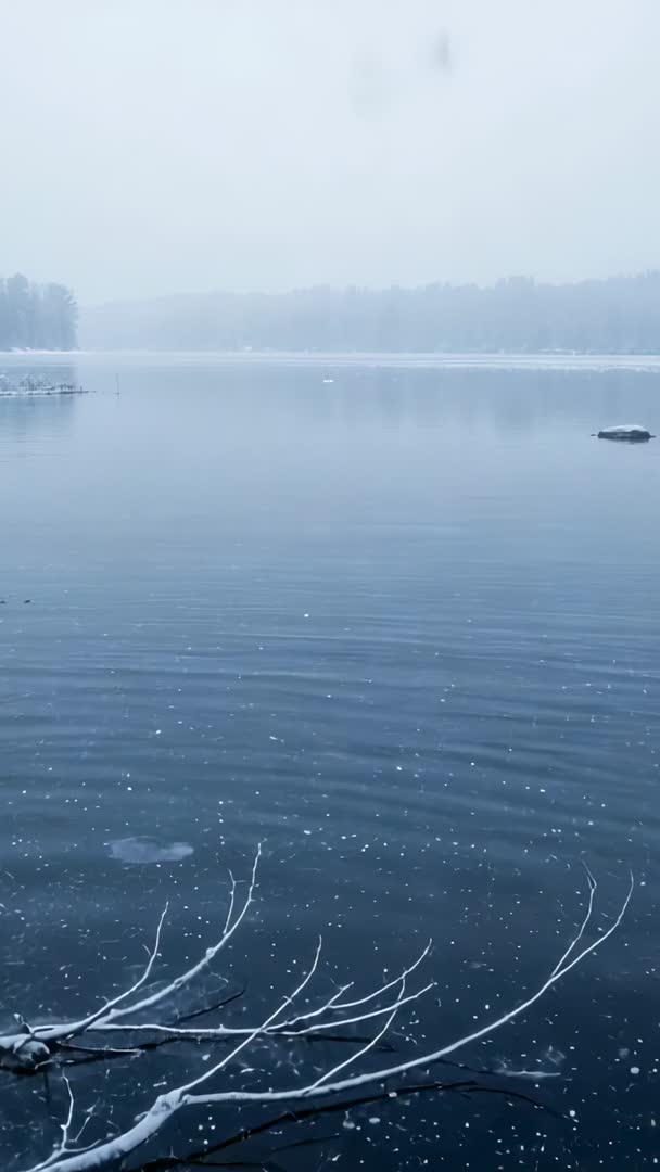 - Falling Snowflakes Dusting Branch While Calm Lake Surface Rippling in Misty Winter Vertical Clip