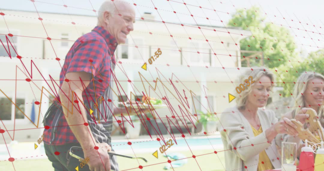 The scene captures a joyful family moment where a senior man is serving skewers during an outdoor barbecue, while two females are assembling burgers at a wooden table. Set against a bright and sunny background with a lush green garden, the overlay of graphs suggests dynamics and interactions, emphasizing community and familial bonds. Ideal for advertisements, articles on family unity, outdoor eating culture, or as a background for related culinary topics.