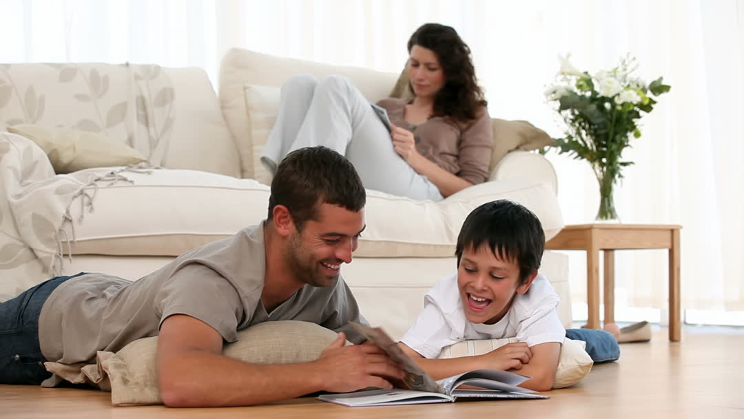 Father helping son with homework while mother reads on cozy couch. Perfect for themes of parenting, education, family values, and leisure. Great for promoting home learning environments and family bonds.