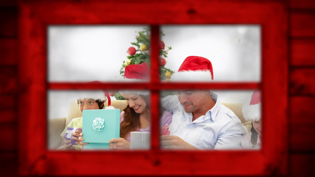 A family joyfully exchanging Christmas presents beside a festively decorated tree seen through a vividly painted red window frame. Perfect for capturing themes of warmth, togetherness, and holiday spirit. Ideal for use in holiday advertisements, Christmas cards, or festive blog posts.