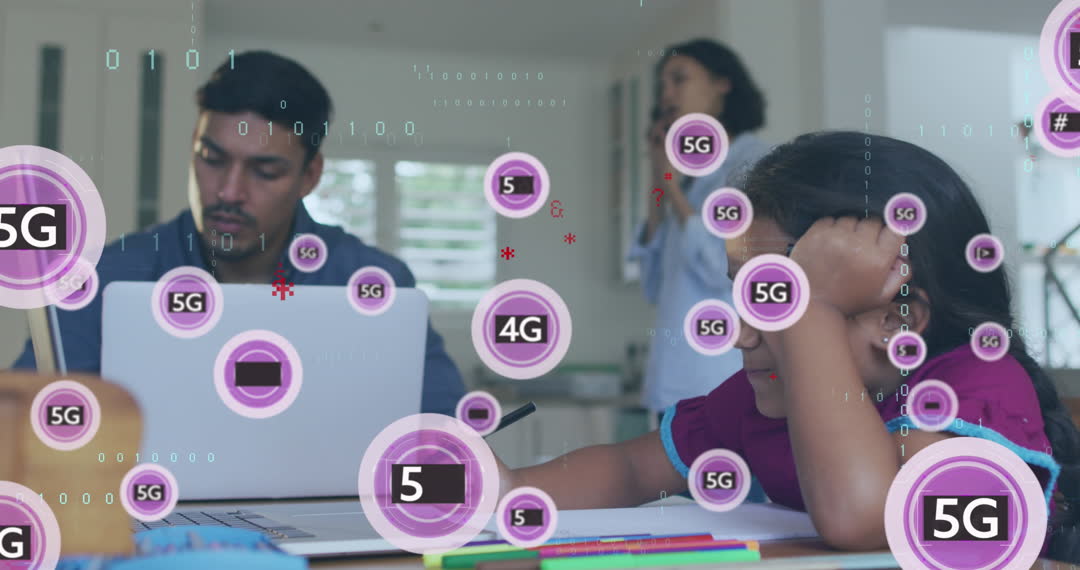 Illustrates impactful use of 5G technology within family environment featuring focus on remote work and education activities. Showcases modern digital lifestyle enabling seamless connectivity and multitasking roles among family members. Suitable for content on smart home technologies, advancements in digital communications, educational tools, or promoting telecommuting solutions.