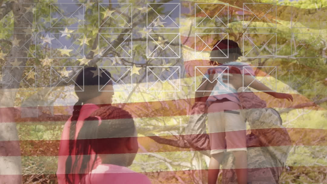 Image depicting a family with an African American male soldier and their children, superimposed over the American flag with digital envelopes symbolizing communication. Powerful representation of patriotism, military service, and the importance of family connections. Could be used in articles about military family life, patriotism, or digital communication within armed forces.