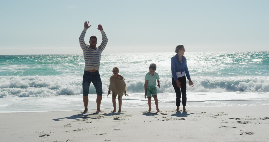 - Family Enjoying Beach Fun and Jumping Waves Together