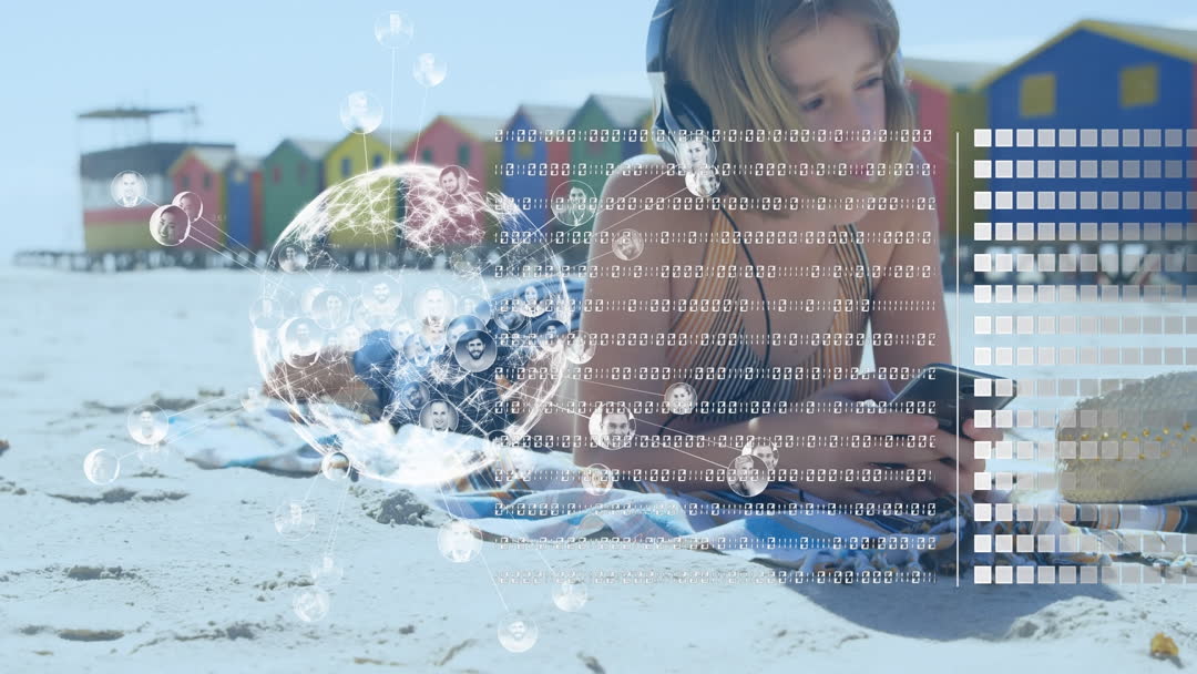 Beach scene blending with elements of technology, showcasing people relaxing around digital symbols and binary coding overlay. Suited for concepts of technology intersecting with everyday life, summer vacations, and futuristic vacation themes.
