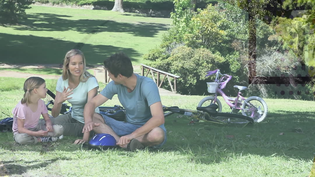 Family spending quality time during an outdoor picnic on a sunny day. Parents sitting with a young daughter on grass, with bicycles nearby. This portrays family bonding, relaxation, and leisure activities, ideal for adverts or articles on lifestyle, recreation, or outdoor family events.