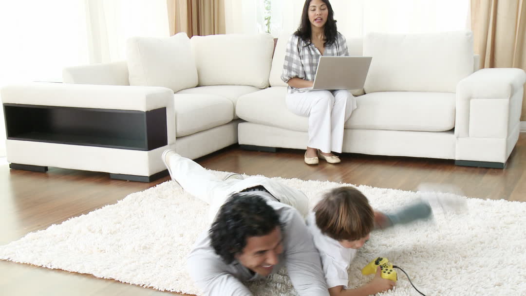 Father and son enjoy playing video games on a plush carpet, while mother works on a laptop from the sofa, illustrating modern family life and leisure activities. Useful for topics related to family bonding, work-life balance, and technology in daily life.