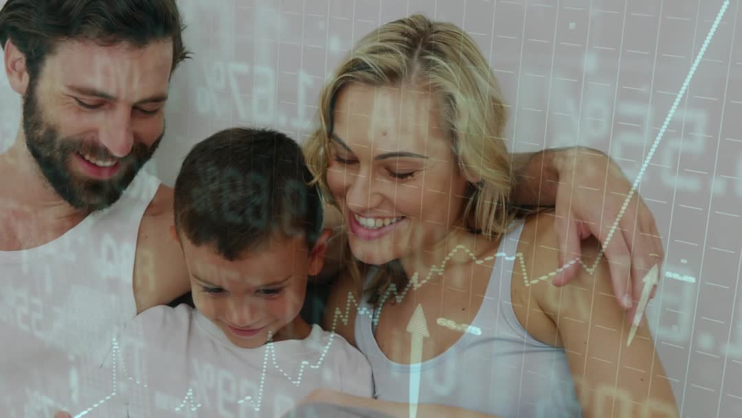 Warm family scene showing parents leaning over child using tablet while translucent financial charts and upward graph overlay screen. Useful for promoting financial education apps, family investing platforms, fintech marketing, and online courses about money management. Working well for hero banners, social media ads, explainer videos, blog headers, and corporate presentations focused on financial literacy or multigenerational wealth. Emphasizing themes of bonding, learning, digital technology, and modern family life. Footage offering natural smiles, close-up interaction with device, and clear area for adding animated graphics or text overlays.
