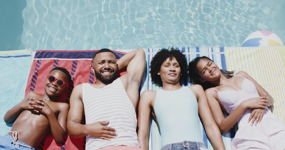 A cheerful African American family of four enjoys a sunny day, lying on colorful towels by a pool. The scene highlights warmth and relaxation. Perfect for usage in advertisements for family resorts, swimwear promotions, summer vacation packages, or parenting articles focused on quality family time during summer holidays.