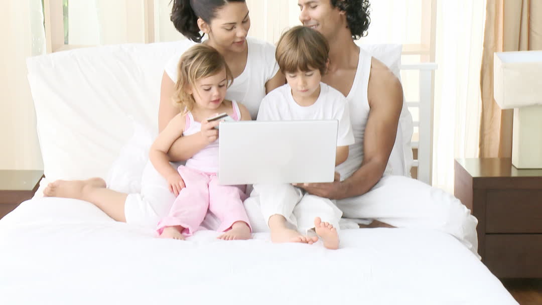 Family Relaxing in Bedroom Using Laptop Together Video
