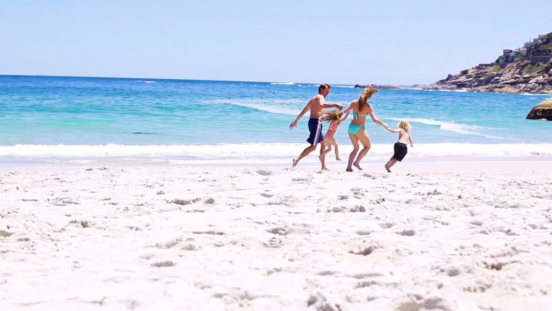 The video depicts a family enjoying a joyful moment while running on the vibrant, sunny beach. The clear, blue ocean encompasses the horizon on a bright day, providing an inviting and fun atmosphere perfect for a celebratory day by the sea. This visual captures the essence of family bonding and the charm of a beach holiday. Ideal for use in travel brochures, family-oriented vacation advertisements, or motivational outdoor leisure activity promotions.