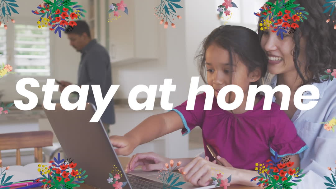 Illustrates concept of a family adhering to stay-at-home guidelines while bonding over digital activities. The videory highlights the importance of family togetherness, digital learning, and remote work during extended home stays. Useful for articles or promotions related to family wellbeing, remote education, and safety guidelines.