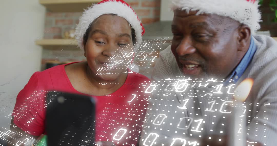 Video clip featuring two family members wearing Santa hats, leaning toward smartphone for video call while holographic binary overlay floats across frame. Candlelight and wrapped gift box adding warm holiday atmosphere. Faces showing joy and engagement, conveying close virtual connection across generations. Horizontal composition with tight mid-shot, natural indoor lighting, shallow depth of field, practical for quick edits and motion graphics overlays. Use for holiday marketing, telecom and tech campaigns promoting virtual gatherings, remote gifting, secure holiday communication. Use on social media ads, banner headers, landing pages, greeting card videos, corporate holiday emails, blog posts about family and technology, senior care outreach, or virtual event promotions. Edit into promotional reels, broadcast spots, or website hero sections to highlight fusion of festive tradition and modern digital connection.