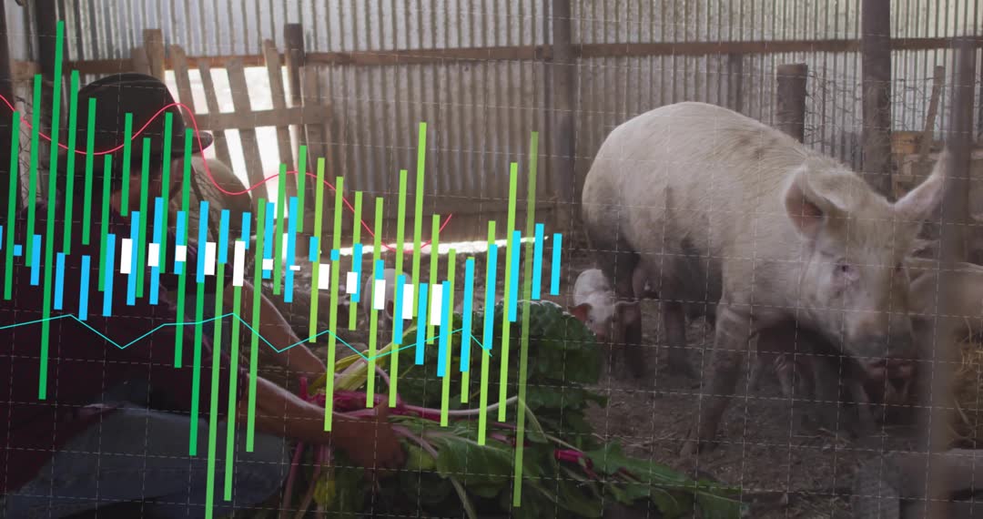 This depiction effectively combines traditional farming activities with modern data analytics, capturing a farm worker feeding pigs while animated bar and line charts overlay the scene. It signifies the growth and productivity trends in agriculture, suggesting rural sustainability and technological integration in farming. Useful for documentaries, agricultural studies, or presentations on sustainable livestock practices and rural development.