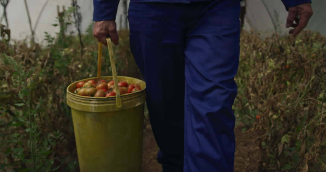A mature man in work clothes is carrying a bucket filled with freshly harvested tomatoes. The video captures the essence of organic farming and hard work. It is ideal for use in agricultural publications, farming blogs, and articles on sustainable food practices as it emphasizes the dependency on farmer closeness for food production and organic produce.