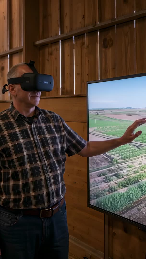 AI Generated Image. Showing middle-aged man wearing VR headset and plaid shirt reaching toward vertical touchscreen displaying aerial farmland inside rustic wooden barn. Demonstrating immersive farm planning and precision agriculture simulation using VR and large display. Enabling interactive farm tours, crop monitoring, and remote scouting visualization for agtech presentations. Ideal for agtech marketing, farm equipment promos, agricultural training modules, investor pitches, and trade show demos. Vertical orientation making ready use for social media reels, mobile ads, and website hero clips. Offering warm wood tones and clear landscape graphics for overlay text, branding, and instructional captions. Licensing useful for editorial coverage of agricultural technology, farmer education, smart farming demonstrations, and digital twin showcases.
