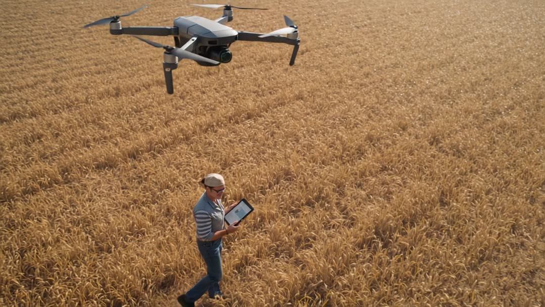 AI Generated Image. Footage showing operator wearing cap and sunglasses, walking through ripe wheat, tapping tablet and guiding quadcopter for aerial scanning. Drone-mounted camera giving wide view of golden crop rows with drone hovering in close foreground. Clip suiting marketing for precision farming platforms, agritech startups and agricultural equipment demos, while supporting educational content on remote sensing and modern agronomy. Serving as hero footage for websites, background for presentations, commercial ads, social media reels and broadcast segments on modern agriculture. Adding telemetry overlays, NDVI layers, flight path animations and on-screen data to emphasize crop health analysis, yield estimation and smart farming workflows.
