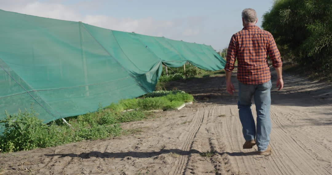 A mature Caucasian farmer walking in an organic agricultural field beside green netting. Suitable for editorial use or illustrating topics on sustainable agriculture, rural living, farming techniques, or organic crop cultivation.