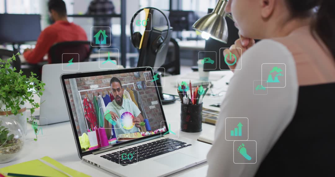 Scene captures office environment where a woman engages in a virtual meeting. Icons float around laptop screen while a man discusses concepts, highlighting modern collaboration tools in fashion industry. Useful to illustrate online meetings, fashion creativity, or technology’s impact on professional settings.