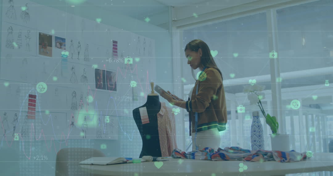 - Fashion Designer Analyzing Trends and Dress Patterns in High-Tech Office