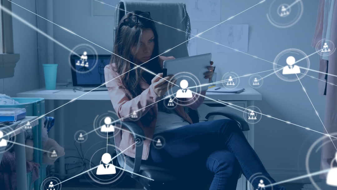 The visual depicts a fashion designer comfortably seated in a contemporary studio, intensely focusing on creating designs using a digital tablet. The video overlays interconnected icons, symbolizing digital networks and creative collaboration. This digital-driven design theme underscores the integration of technology and artistry in modern fashion industries. Use this for content on digital transformation in vogue, tech-driven creativity in fashion, and educational materials on fashion design.