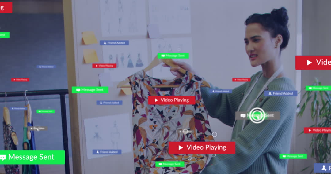 Creative setting showcases a professional fashion designer discussing a clothing item with colleagues, surrounded by floating digital notifications. Suitable for depicting modern workspaces and the impact of technology on the creative process, social media interactions, and collaboration in fashion businesses.
