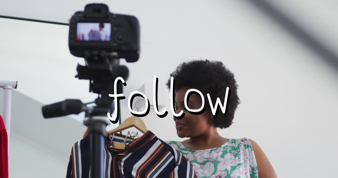 African American woman sharing fashion tips with her audience using camera setup for vlogging. This video is ideal for promoting content creation tools, fashion tips, social media marketing, and engaging with audiences online. Useful for blogs and articles about influencer marketing, vlogging guides, or fashion tutorials.