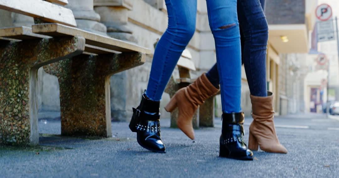Urban scene focused on two people wearing fashionable boots and jeans, embodying modern street style. Potential use for fashion branding, urban lifestyle promotions, or social media content emphasizing trendy footwear.