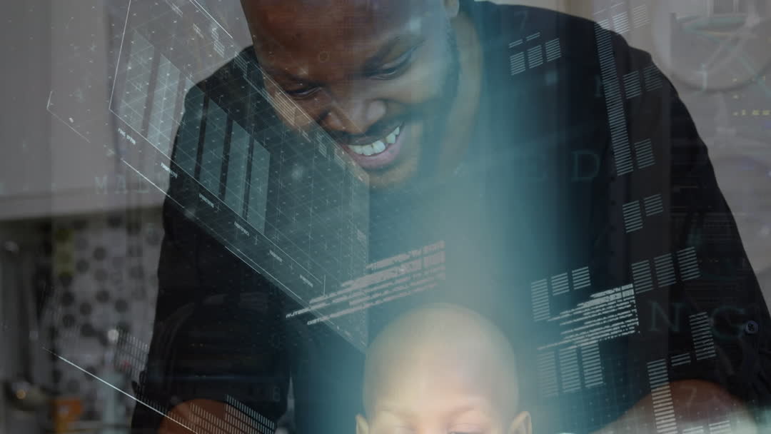 Seamlessly blending family warmth with futuristic technology, this visual depicts a father enthusiastically engaged with a child via a digital tablet. Overlayed digital graphics suggest connectivity and a tech-forward atmosphere suitable for storytelling in advertising aimed at smart home technologies, educational innovations, or personal anecdotes of balancing family and digital growth.