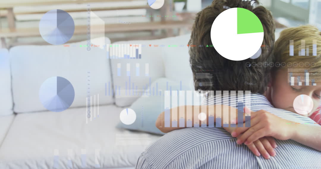 Father and son embracing a close bond while digital data graphics overlay pile charts and diagrams, conveying integration of family connections with technological elements. This content could be ideal for showcasing the impact and intersection of digital advancements in family communications or for educational purposes in technology-driven studies.