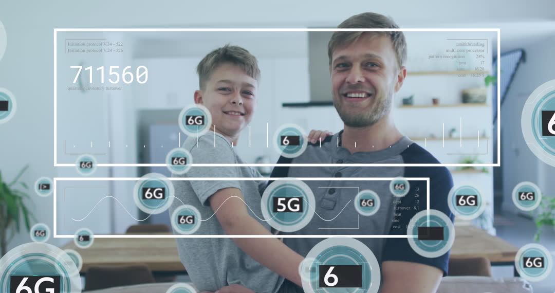 Father happily holding son at home surrounded by 6G technology icons and digital elements, conveying modern communications and technological advancement. Perfect for illustrating the impact of future technology on everyday life, family bonding through tech, or the power of next-generation networks.