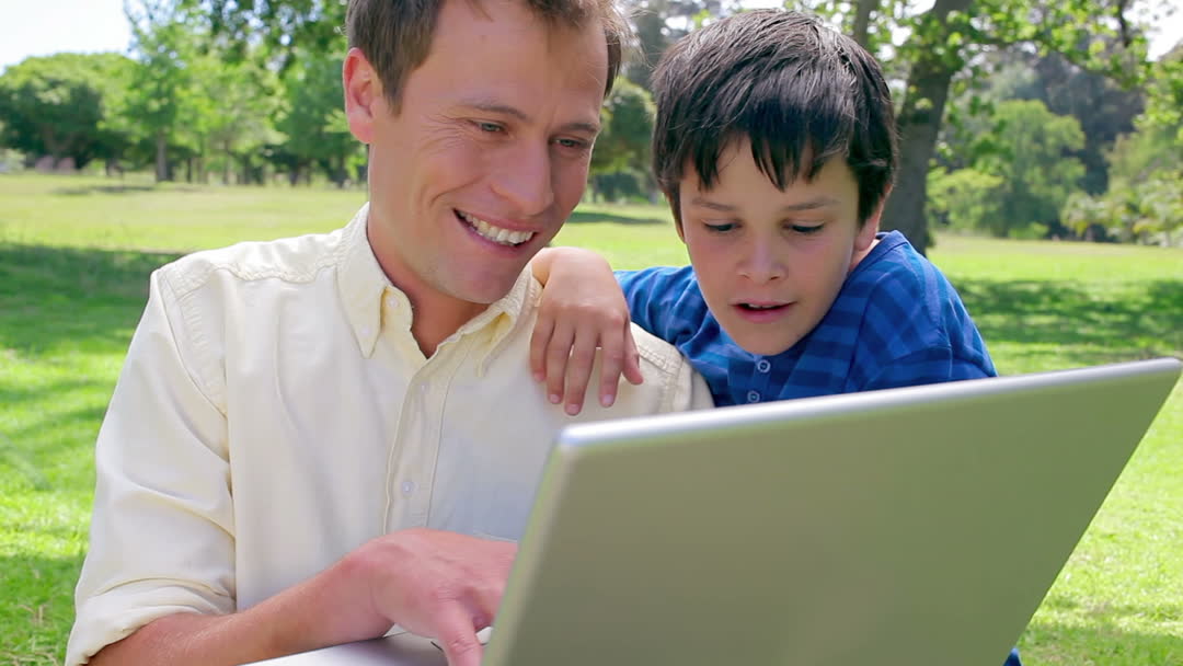 - Father and Son Enjoying Laptop in Park on Sunny Day